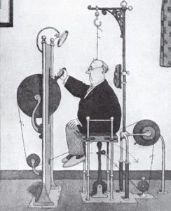 In Heath Robinson’s time, getting dressed in the morning was considerably more complicated than nowadays. Stretchy fabrics were unknown and trousers were suspended on braces with adjusters to pull them up. You could waste a lot of time getting a comfortable fit and avoiding a lop-sided slant. No worry, thought Heath Robinson. All this bother can be ended with a pair of automated braces. One push of a button and you get a good pull-up. Then you can stride off to work on time.