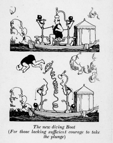 Heath Robinson designed a diving boat to launch reluctant bathers into the water.