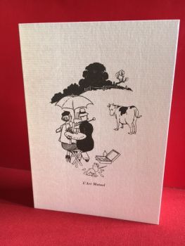 In 1937 Heath Robinson published a self-mocking little book called How to be the Perfect Husband. The words were by his five-times collaborator K. R. G. Browne, grandson of Hablot Browne who as ‘Phiz’ illustrated many of Dickens’ books, but what keeps this book alive and fresh is Heath Robinson’s drawings, including the delightful plein air life-drawing tableau depicted in L’Art Mutuel. Only a true artist could capture in a few deft strokes the coyness of the model, in this case a cow.